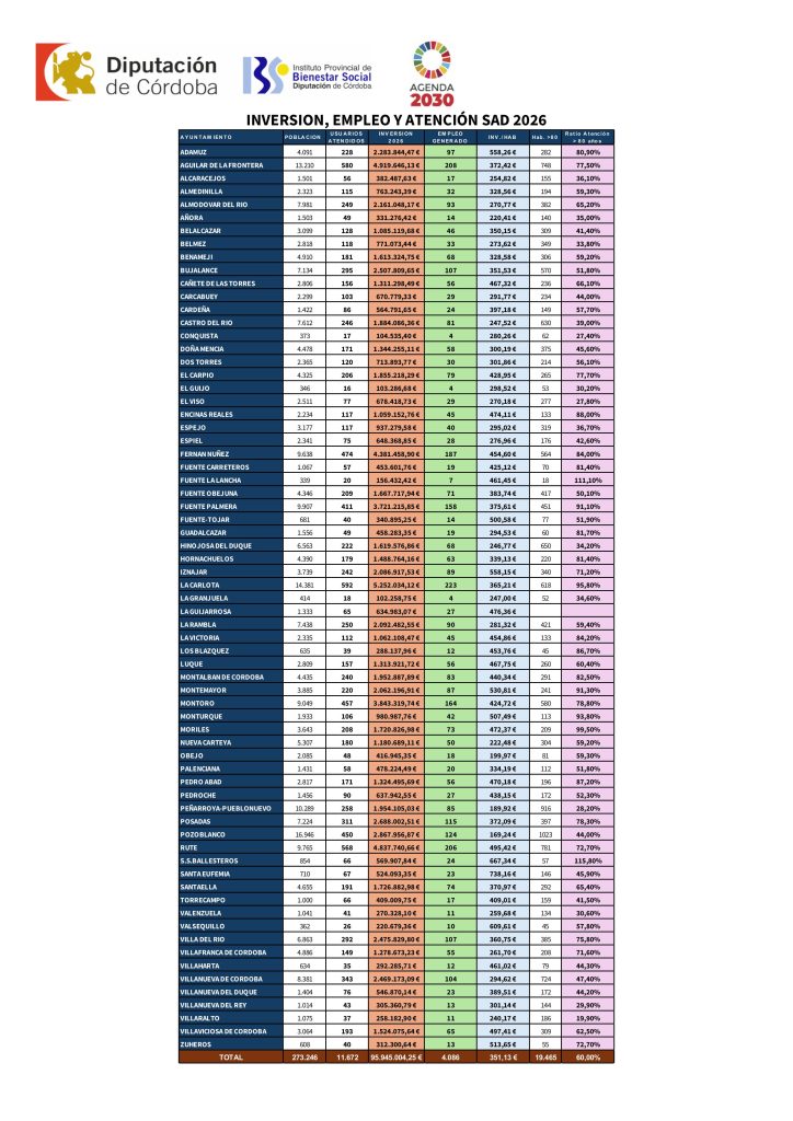 En este sentido, ha añadido que “el próximo año, el Servicio de Ayuda a Domicilio superará las 11.600 personas atendidas en toda la provincia. Más del 60% de la población mayor de 80 años recibirá este servicio en su propio domicilio, alcanzando en muchos municipios niveles de cobertura del 70, 80 e incluso 90% de su población mayor de 80 años”.