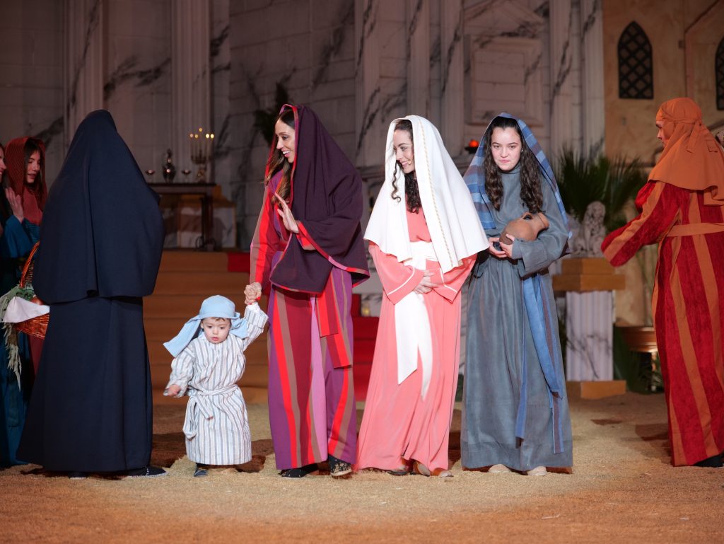 La siguiente escena es la aparición de los pastores y luego el nacimiento de Jesús, representado por dos bebés, Triana y Elías, de apenas 3 o 4 meses. De sus cuidados se encargan San José, que es Pablo López, y la Virgen María, encarnada por Marta García.